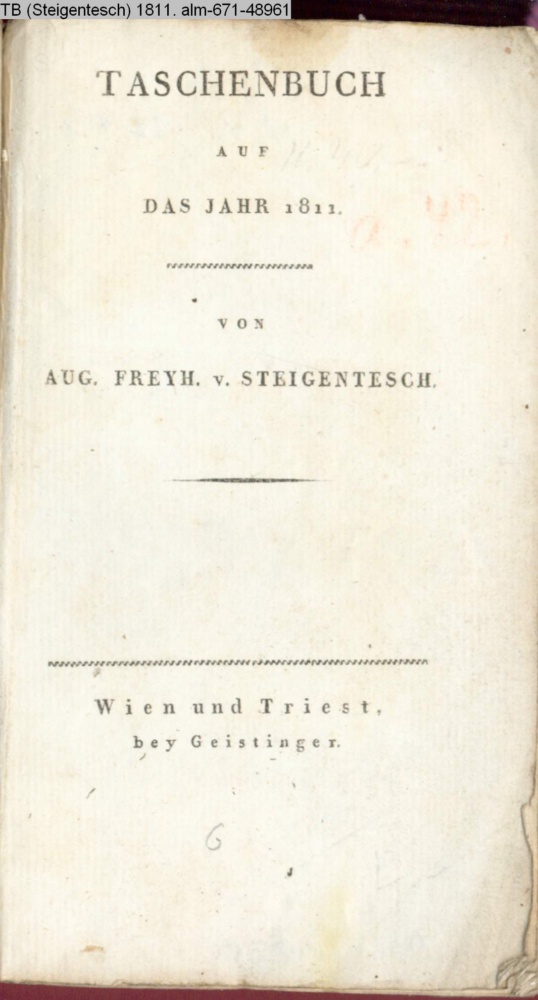 TASCHENBUCH / AUF / DAS JAHR 1811. / VON / AUG. FREYH. v. STEIGENTESCH. / Wien und Triest, / bey Geistinger
