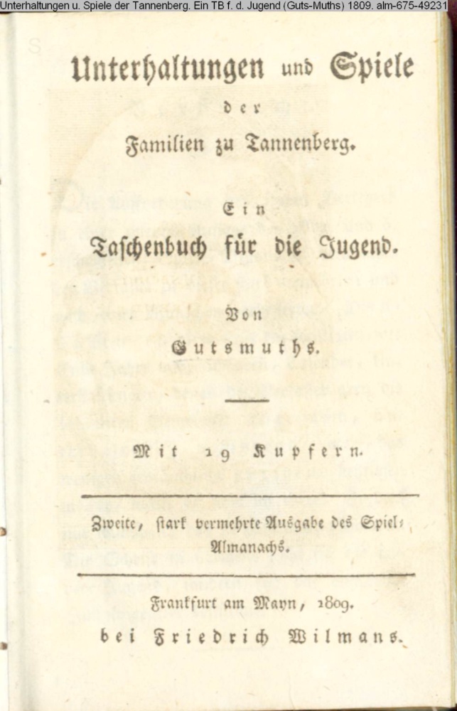 Unterhaltungen und Spiele / der / Familien zu Tannenberg. / Ein / Taschenbuch für die Jugend. / Von / Gutsmuths. / MIt 19 Kupfern. / Zweite, stark vermehrte Ausgabe des Spiel- / Almanachs. / Frankfurt am Mayn, 1809. / bei Friedrich Wilmans