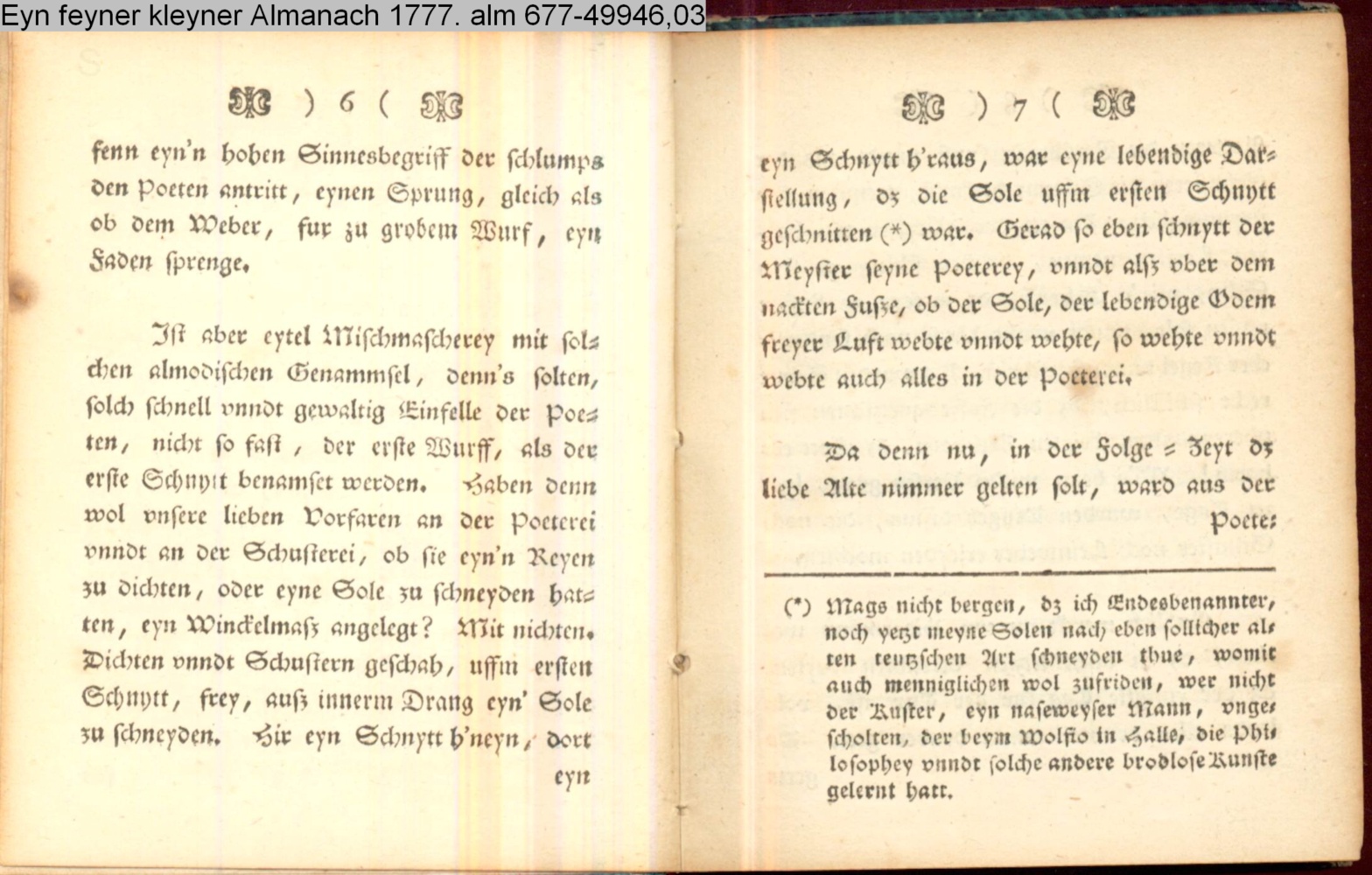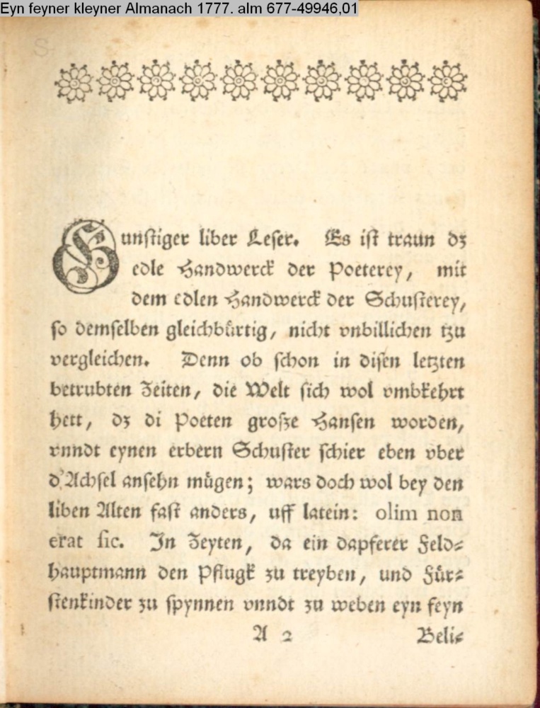 Gunstiger liber Leser. Es ist traun dz edle Handwerck der Poeterey, mit dem edlen Handwerck der Schusterey, so demselbigen gleichbürtig, nicht unbilllichenen tzu vergleichen.…