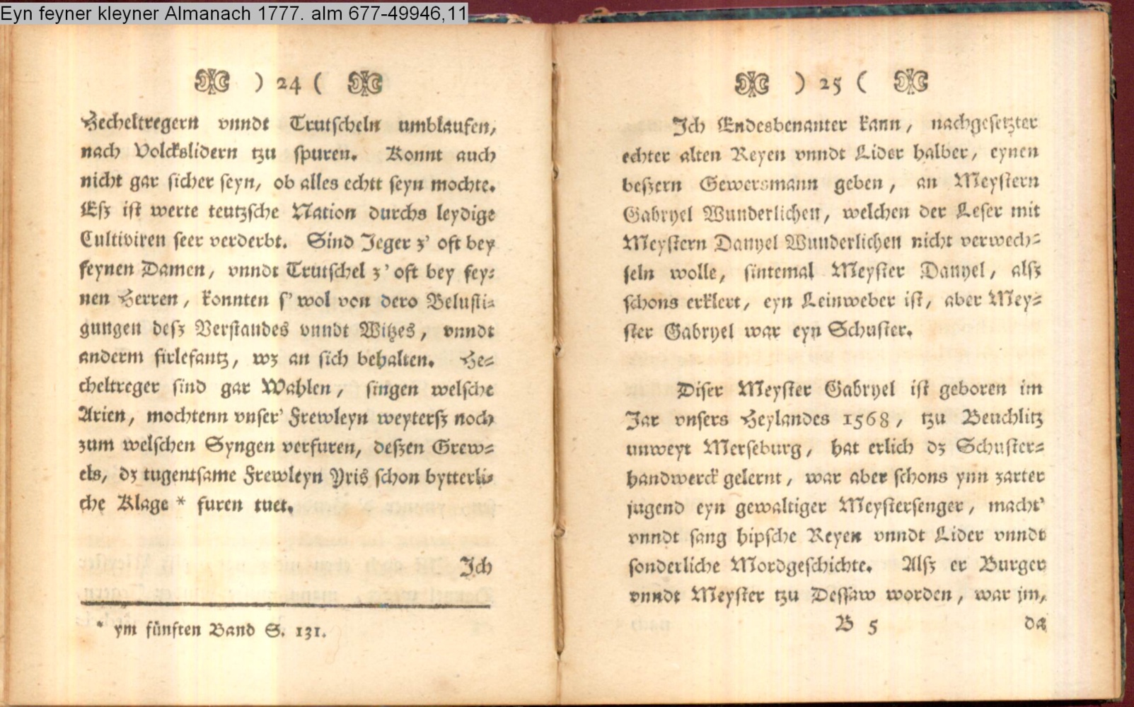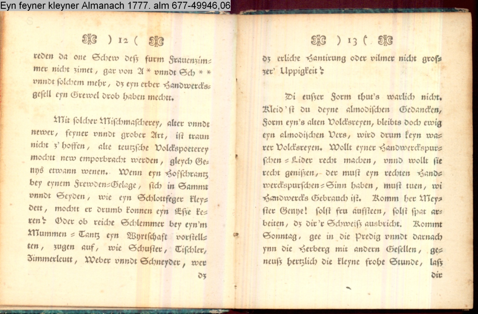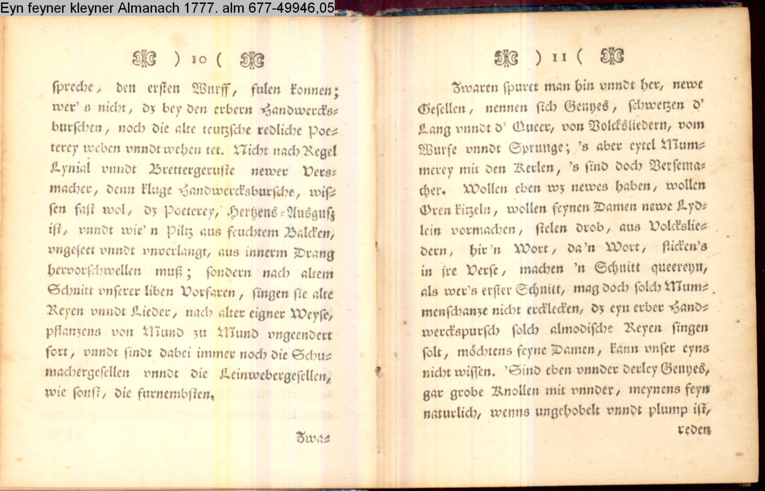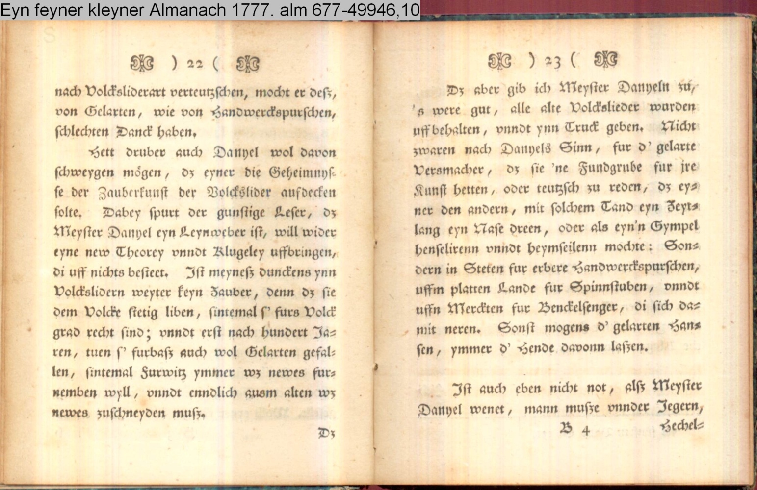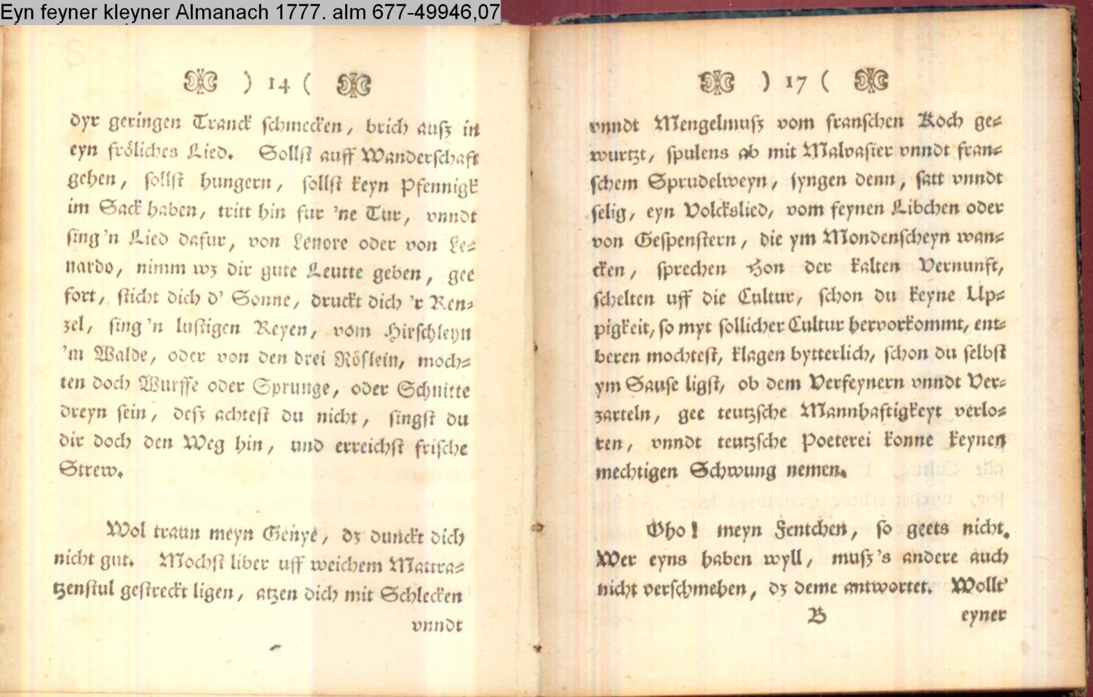 Vorwort lt. L/R 203: »Eine geistreiche Antwort auf Bürgers in seinem Aufsatz »Aus Daniel Wunderlichs Buch« enthaltene, überschwengliche Anpreisung der Volkspoesie. Die Vorreden beider Bändchen greifen Bürgers Argumente auf und treiben damit ihren Scherz. Einige der Poesien sind vortreffliche Parodien echter Volkslieder, zum Teil ist ihnen dichterischer Wert nicht abzusprechen.« s. hierzu: G. A. Bürger »Aus Daniel Wunderlichs Buch« in: Deutsches Museum 1776 1. Bd. S. 440; sowie Bürgers Reaktion auf Nicolais Almanach erstmals gedruckt in: »Aus Daniel Wunderlich's Buche. III. Zur Beherzigung an die Philosophunculos« in: G. A. Bürger's sämmtliche Werke. Herausgegeben von Karl v. Reinhard. Sechster Band. Vollendete, rechtmäßige Ausgabe. Berlin. Bei E. H. G. Christiani. 1824 S. 194-199