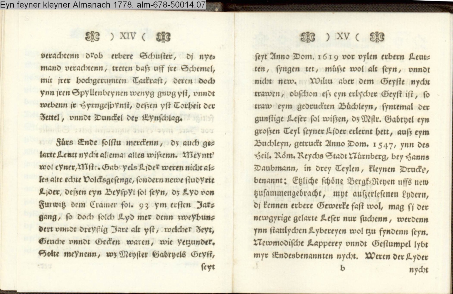 Vorwort lt. L/R 203: »Eine geistreiche Antwort auf Bürgers in seinem Aufsatz »Aus Daniel Wunderlichs Buch« enthaltene, überschwengliche Anpreisung der Volkspoesie. Die Vorreden beider Bändchen greifen Bürgers Argumente auf und treiben damit ihren Scherz. Einige der Poesien sind vortreffliche Parodien echter Volkslieder, zum Teil ist ihnen dichterischer Wert nicht abzusprechen.« s. hierzu: G. A. Bürger »Aus Daniel Wunderlichs Buch« in: Deutsches Museum 1776 1. Bd. S. 440; sowie Bürgers Reaktion auf Nicolais Almanach erstmals gedruckt in: »Aus Daniel Wunderlich's Buche. III. Zur Beherzigung an die Philosophunculos« in: G. A. Bürger's sämmtliche Werke. Herausgegeben von Karl v. Reinhard. Sechster Band. Vollendete, rechtmäßige Ausgabe. Berlin. Bei E. H. G. Christiani. 1824 S. 194-199
