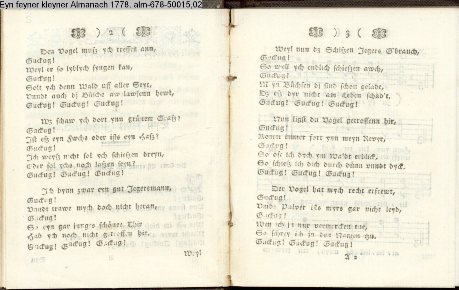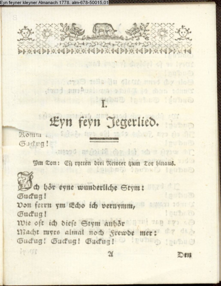 I. / Eyn feyn Jegerlied. / Ym Ton: Eß rytten drei Reiuter zum Tor hinaus