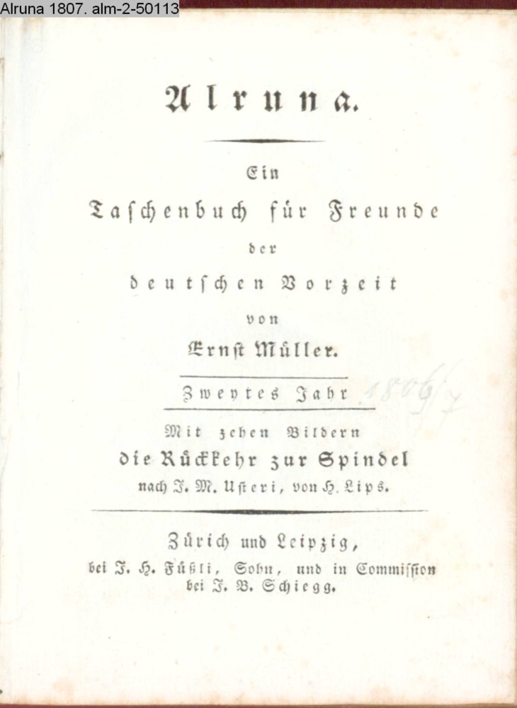 Alruna. / Ein / Taschenbuch für Freunde / der / deutschen Vorzeit / von / Ernst Müller. / Zweytes Jahr. / Mit zehen Bildern / die Rückkehr zur Spindel / nach J. M. Usteri, von H. Lips. / Zürich und Leipzig, / bey J. H. Füßli, Sohn, und in Commission / bey J. B. Schiegg