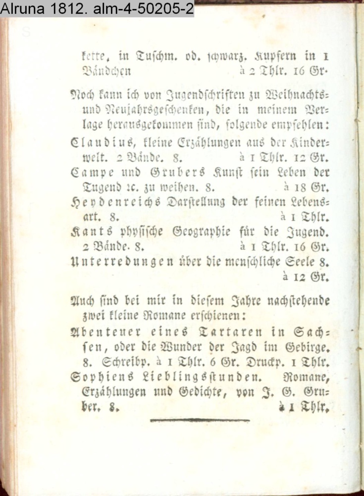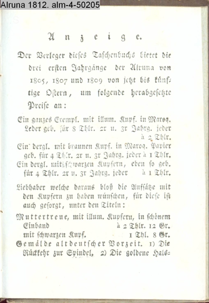Anzeige. / Der Verleger dieses Taschenbuchs bietet die / drei ersten Jahrgänge der Alruna von 1805, 1807, 1809 von / jetzt bis künftige Ostern, um folgende herabgesetzte Preise an: