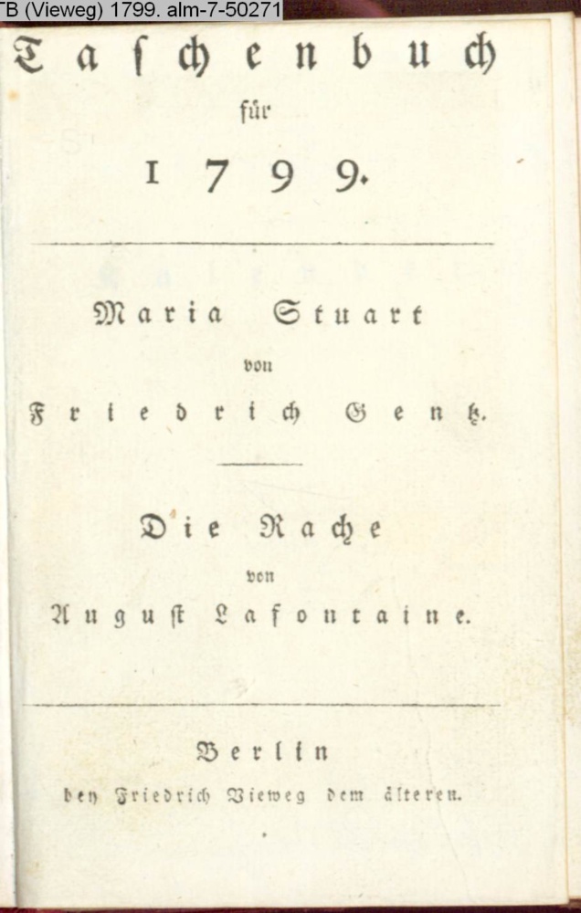 Taschenbuch / für / 1799. / Maria Stuart / von / Friedrich Gentz. / Die Rache / von / August Lafontaine. / Berlin / bey Friedrich Vieweg dem älteren