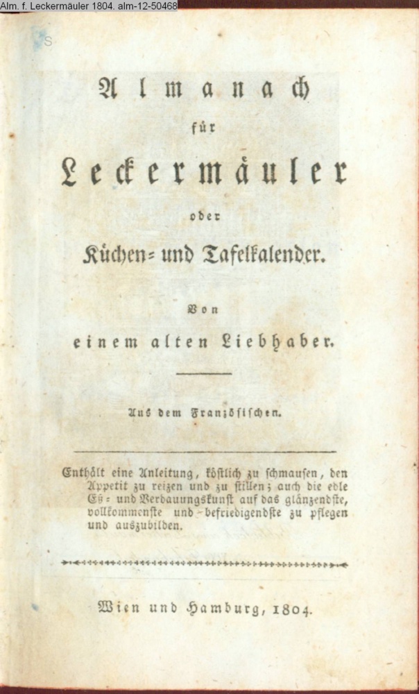 Almanach / für / Leckermäuler / oder / Küchen- und Tafelkalender. / Von / einem alten Liebhaber. / Aus dem Französischen. / Enthält eine Anleitung, köstlich zu schmausen, den / Appetit zu reizen und zu stillen; auch die edle / Eß- und Verdauungskunst auf das glänzendste / vollkommenste und befriedigenste zu pflegen / und auszubilden. / Wien und Hamburg, 1804