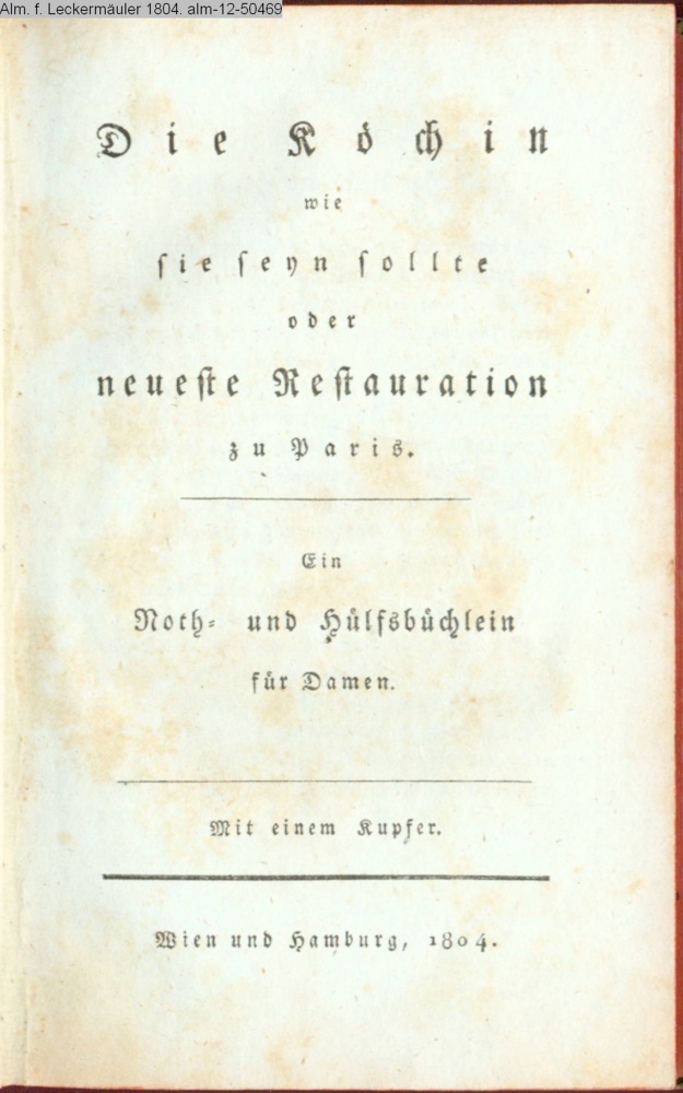 Die Köchin / wie / sie seyn sollte / oder / neueste Restauration / zu Paris. / Ein / Noth- und Hülfsbüchlein / für Damen. / Mit einem Kupfer. / Wien und Hamburg, 1804
