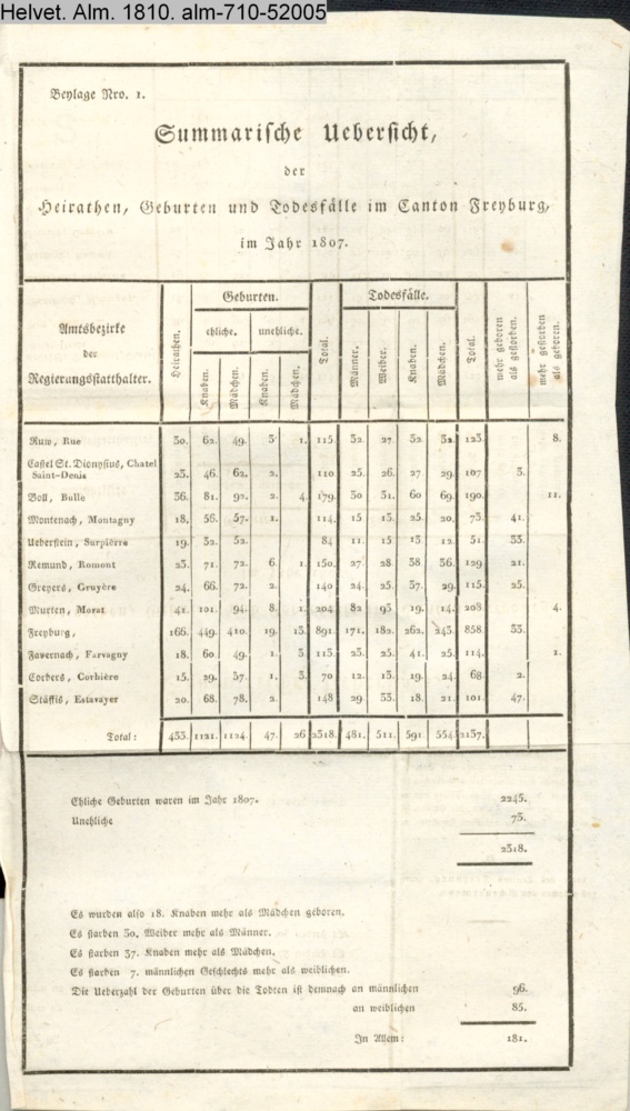 Summarische Uebersicht, / der / Heirathen, Geburten und Todesfälle im Canton Freyburg, / im Jahr 1807