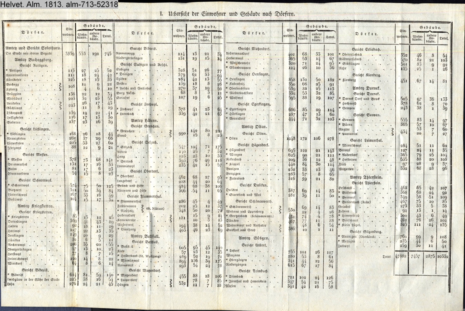 II. Uebersicht der Einwohner und Gebäude nach den neuen Amteyen. / III. Uebersicht des Viehbestands nach den Amteyen. / IV. Uebersicht der Liegenschaften mit Ausnahme der Waldungen / V. Uebersicht des Ertrags der Zehnten nach einem Durchschnitte von zehn Jahren