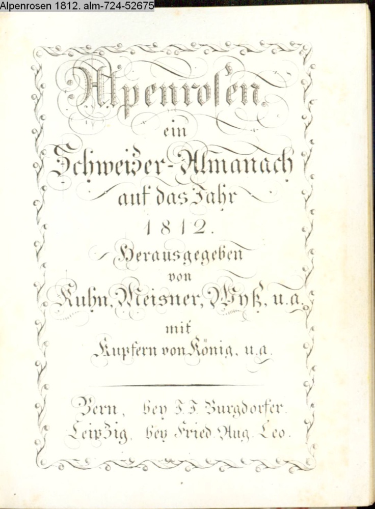 Alpenrosen. / ein / Schweizer-Almanach / auf das Jahr / 1811. / Herausgegeben / von / Kuhn, Meisner, Wyß, u.a. / mit / Kupfern von König, u.a. / Bern, bey J. J. Burgdorfer. / Leipzig, bey Fried. Aug. Leo