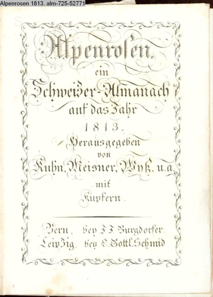 Alpenrosen. / ein / Schweizer-Almanach / auf das Jahr / 1813. / Herausgegeben / von / Kuhn, Meisner, Wyß, u.a. / mit / Kupfern. / Bern, bey J. J. Burgdorfer. / Leipzig, bey C. Gottl. Schmid