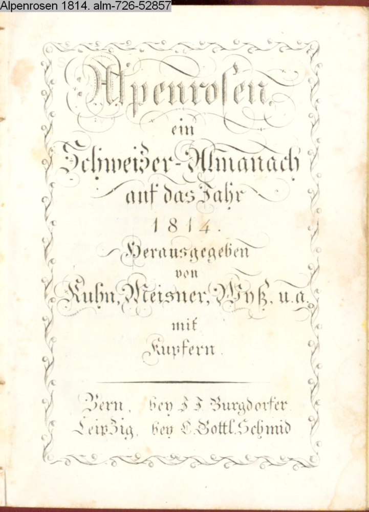 Alpenrosen / ein / Schweizer-Almanach / auf das Jahr / 1814. / Herausgegeben / von / Kuhn, Meisner, Wyß, u.a. / mit / Kupfern. / Bern, bey J. J. Burgdorfer. / Leipzig, bey C. Gottl. Schmid