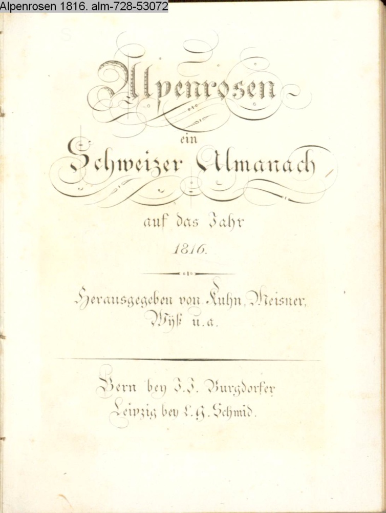 Alpenrosen / ein / Schweizer Almanach / auf das Jahr / 1816. / Herausgegeben von Kuhn, Meisner, / Wyß, u.a. / Bern, bey J. J. Burgdorfer. / Leipzig, bey C. G. Schmid
