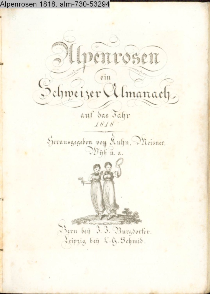 Alpenrosen / ein / Schweizer Almanach / auf das Jahr / 1818 / Herausgegeben von Kuhn, Meisner, / Wyß u.a. / Bern bey J. J. Burgdorfer. / Leipzig bey C. G. Schmid