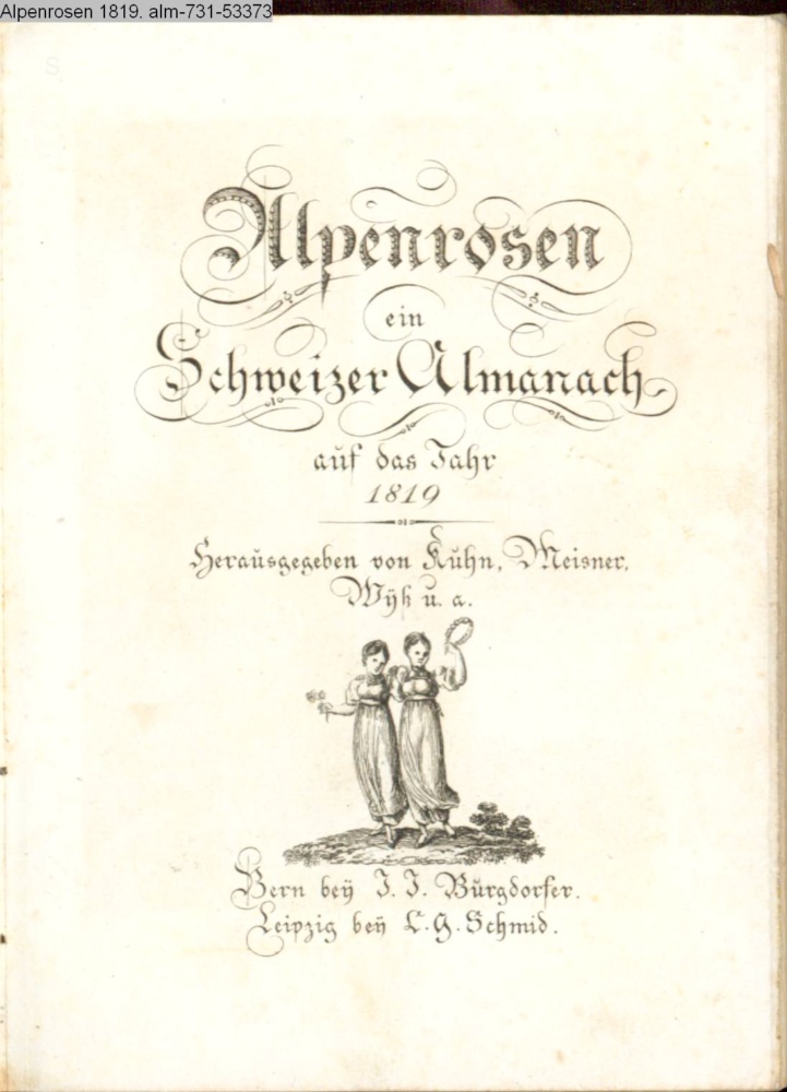 Alpenrosen / ein / Schweizer Almanach / auf das Jahr / 1819 / Herausgegeben von Kuhn, Meisner, / Wyß u.a. / Bern bey J. J. Burgdorfer. / Leipzig bey C. G. Schmid