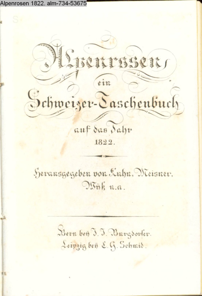 Alpenrosen / ein / Schweizer-Taschenbuch / auf das Jahr / 1822. / Herausgegeben von Kuhn, Meisner, / Wyß u.a. / Bern bey J. J. Burgdorfer. / Leipzig bey C. G. Schmid