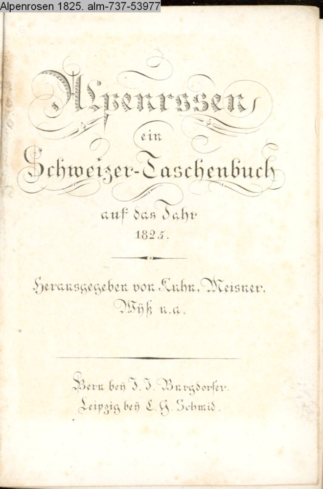Alpenrosen / ein / Schweizer-Taschenbuch / auf das Jahr / 1825. / Herausgegeben von Kuhn, Meisner, / Wyß u.a. / Bern bey J. J. Burgdorfer. / Leipzig bey C. G. Schmid