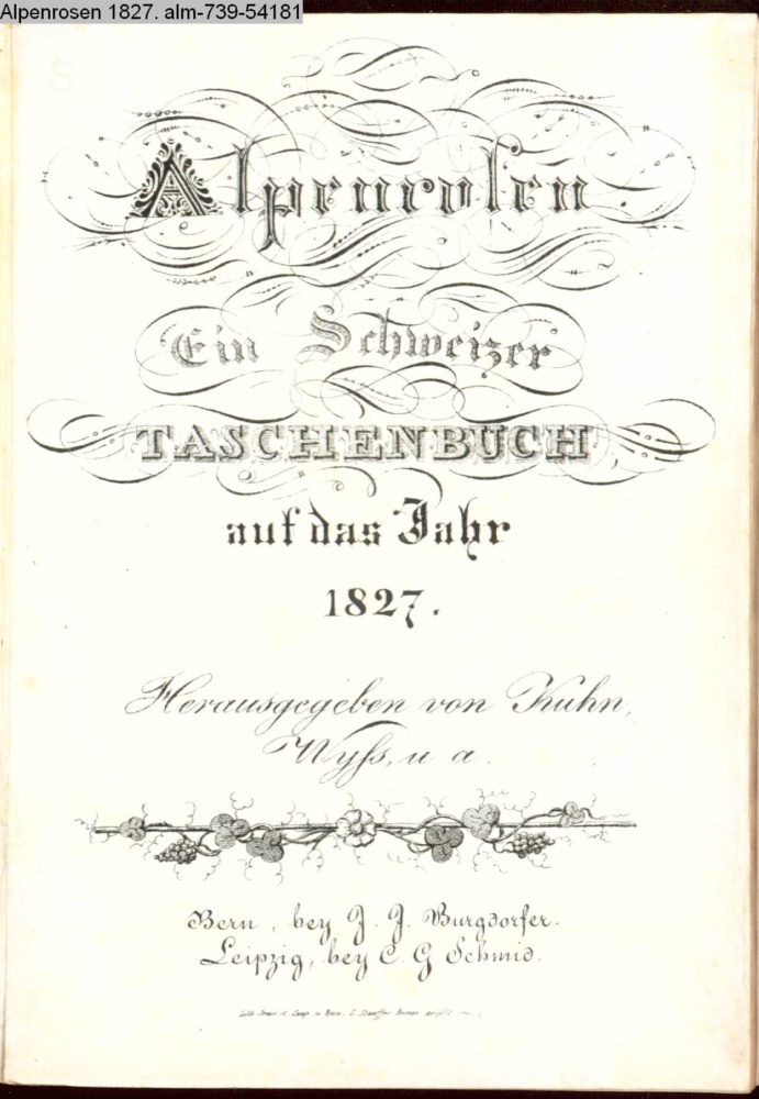 Alpenrosen / Ein Schweizer / TASCHENBUCH / auf das Jahr / 1827. / Herausgegeben von Kuhn, / Wyss, u.a. / Bern, bei J. J. Burgdorfer. / Leipzig, bei C. G. Schmid