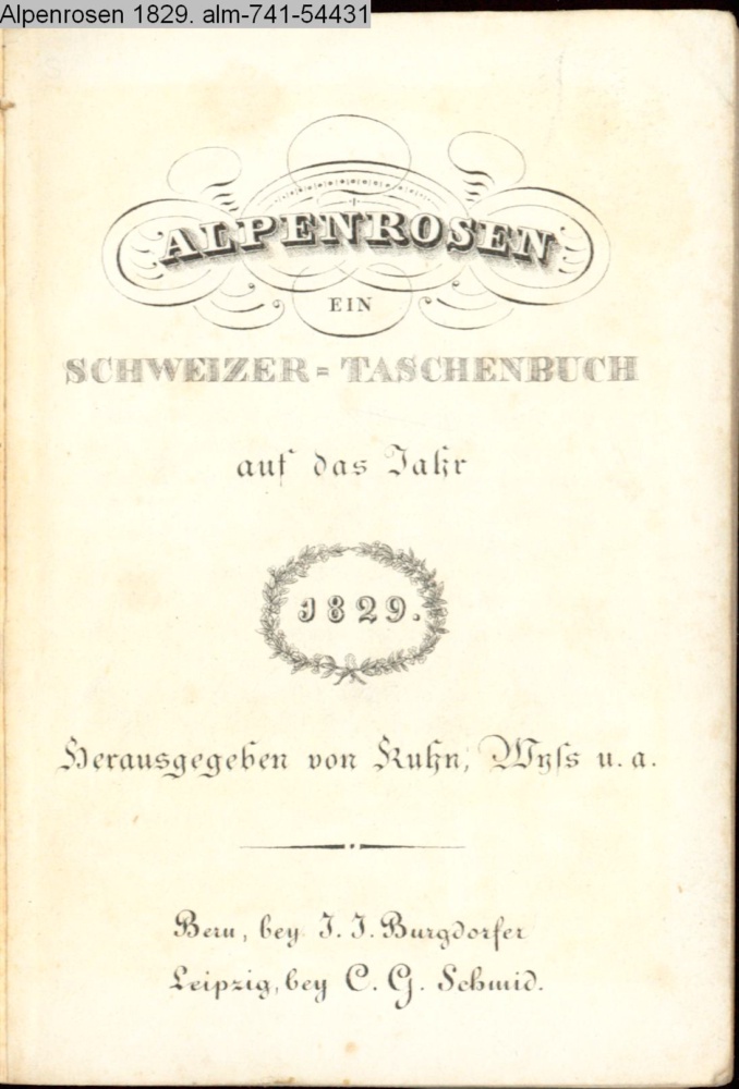 ALPENROSEN / EIN / SCHWEIZER-TASCHENBUCH / auf das Jahr / 1829. / Herausgegeben von Kuhn, Wyss u.a. / Bern, bey J. J. Burgdorfer, / Leipzig, bey C. G. Schmid