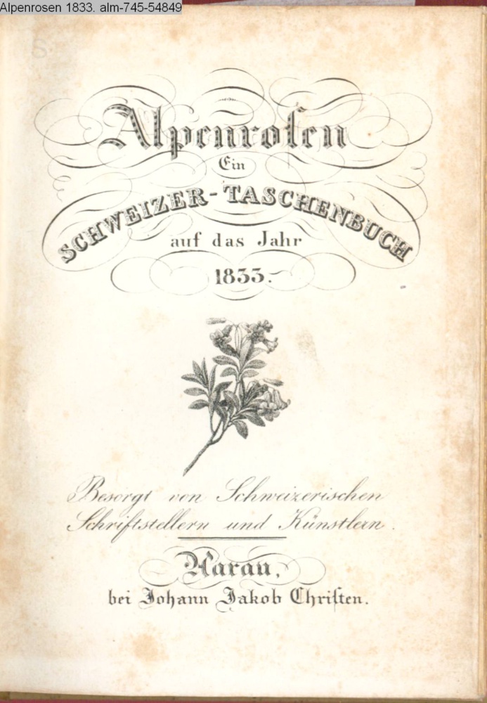 Alpenrosen / ein / SCHWEIZER-TASCHENBUCH / auf das Jahr / 1833. / Besorgt von Schweizerischen / Schriftstellern und Künstlern. / Aarau, / bei Johann Jakob Christen