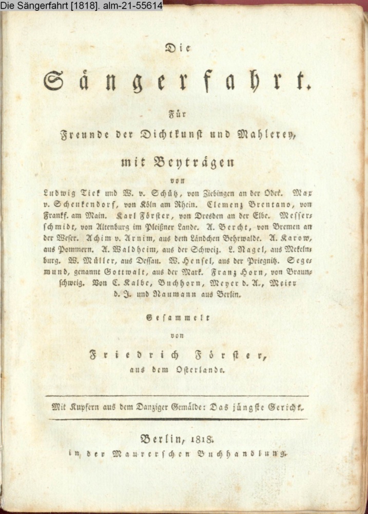 Die Sängerfahrt. / Für / Freunde der Dichtkunst und Mahlerey, / mit Beyträgen / von / Ludwig Tiek und W. v. Schütz, von Ziebingen an der Oder. Max / v. Schenkendorf, von Köln am Rhein. Clemenz Brentano, von / Frankf. am Main. Karl Förster, von Dresden an der Elbe. Messerschmidt, von Altenburg im Pleißner Lande. A. Bercht, von Bremen an / der Weser. Achim v. Arnim, aus dem Ländchen Behrwalde. A. Karow, / aus Pommern. A. Waldheim, aus der Schweiz. L. Nagel, aus Mekeln- / burg. W. Müller, aus Dessau. W. Hensel, aus der Priegnitz. Sege- / mund, genannt Gottwalt, aus der Mark. Franz Horn, von Braun- / schweig. Von C. Kolbe, Buchhorn, Meyer d. Ä., Meier d. J. und Naumann aus Berlin / Gesammelt / von / Friedrich Förster, / aus dem Osterlande. / Mit Kupfern aus dem Danziger Gemälde: Das jüngste Gericht. / Berlin, 1818. / in der Mauererschen Buchhandlung