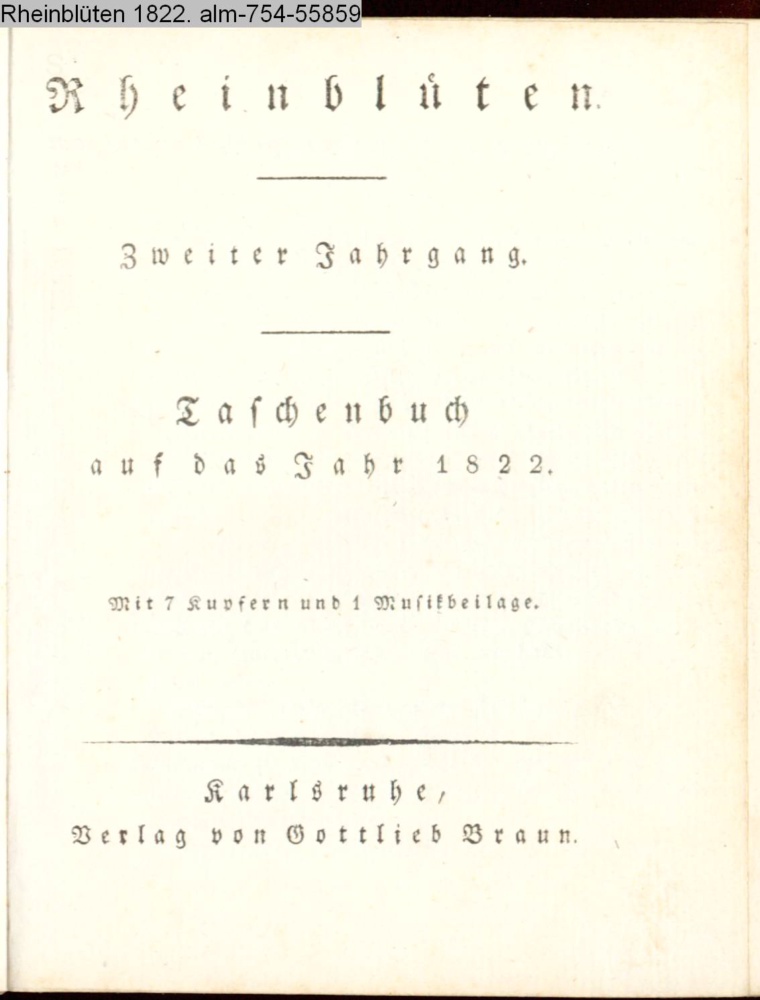 Rheinblüten. / Zweiter Jahrgang. / Taschenbuch / auf das Jahr 1822. / mit 7 Kupfern und 1 Musikbeilage. / Karlsruhe, / Verlag von Gottlieb Braun
