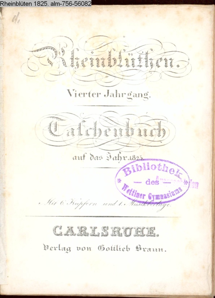 Rheinblüthen. / Vierter Jahrgang. / Taschenbuch / auf das Jahr 1825. / Mit 6 Kupfern und 1 Musikbeilage. / CARLSRUHE. / Verlag von Gottlieb Braun
