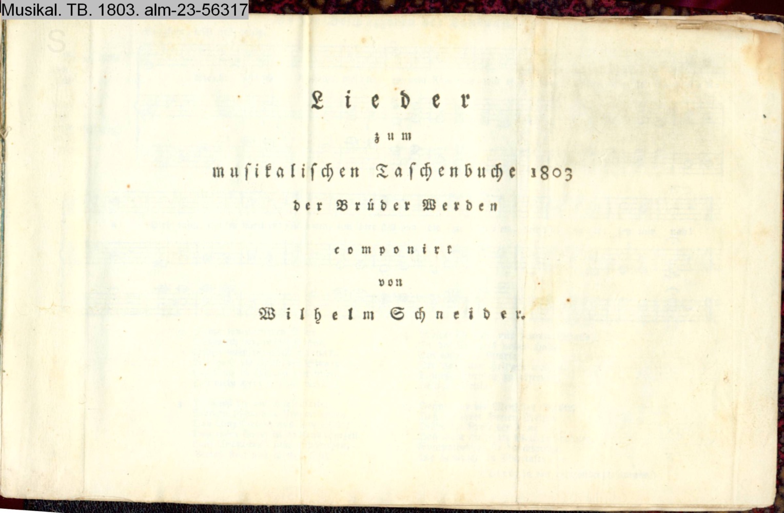 Lieder / zum / musikalischen Taschenbuche 1803 / der Brüder Werden / componirt / von / Wilhelm Schneider