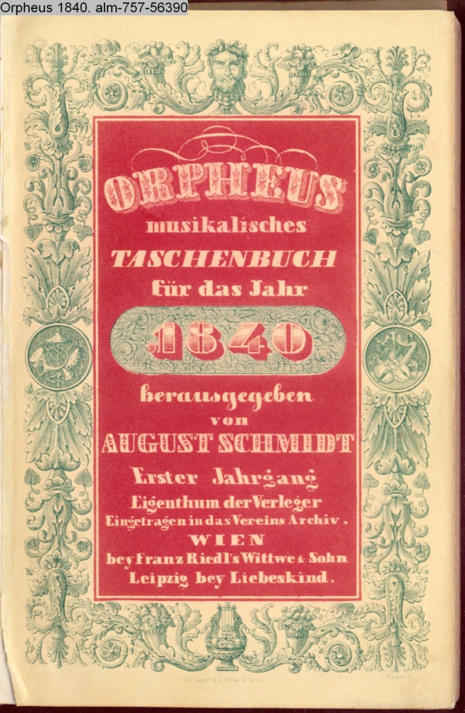 ORPHEUS / musikalisches / TASCHENBUCH / für das Jahr / 1840 / herausgegeben / von / AUGUST SCHMIDT / Erster Jahrgang / Eigenthum der Verleger / Eingetragen in das Vereins Archiv. / WIEN / bey Franz Riedl' s Wittwe & Sohn / Leipzig bey Liebeskind