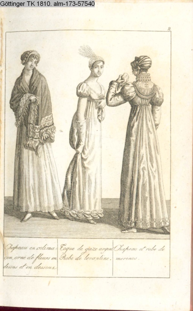 Robe de cour, en sa- / tin; le manteau, en velours. / Robe de gaze, à raies de satin. / Oiseau de paradis. / Ouverture de robe / figurée
