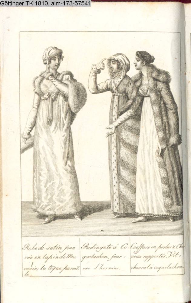 Redingote et toque / fourees de l'hermine. / Toque et redingote gar- / nies en petit gris. / Coeffure formée de ban- / deaux à chatons. Pelis- / se de satin.