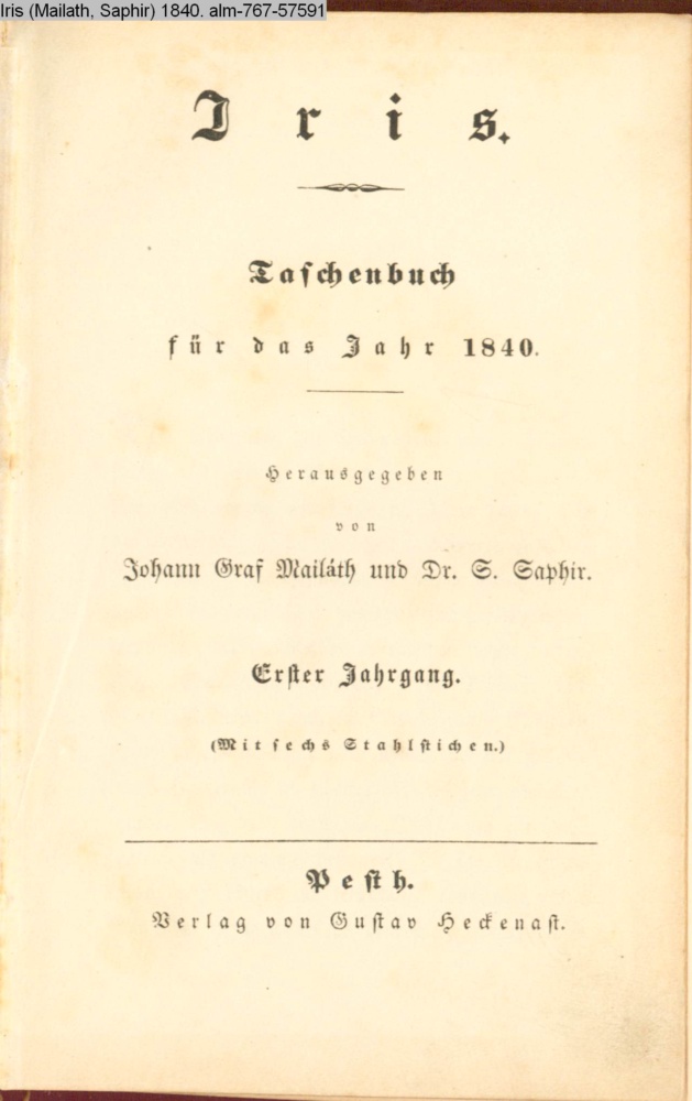 Iris / Taschenbuch / für das Jahr 1840. / Herausgegeben / von / Johann Graf Mailáth und Dr. S. Saphir. / Erster Jahrgang. / (Mit sechs Stahlstichen) / Pesth. / Verlag von Gustav Heckenast.