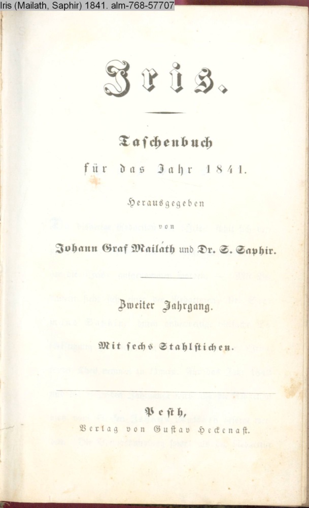Iris / Taschenbuch / für das Jahr 1841. / Herausgegeben / von / Johann Graf Mailáth und Dr. S. Saphir. / Zweiter Jahrgang. / Mit sechs Stahlstichen / Pesth. / Verlag von Gustav Heckenast.