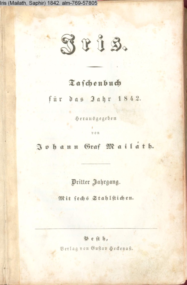 Iris / Taschenbuch / für das Jahr 1842. / Herausgegeben / von / Johann Graf Mailáth / Dritter Jahrgang. / Mit sechs Stahlstichen. / Pesth. / Verlag von Gustav Heckenast.