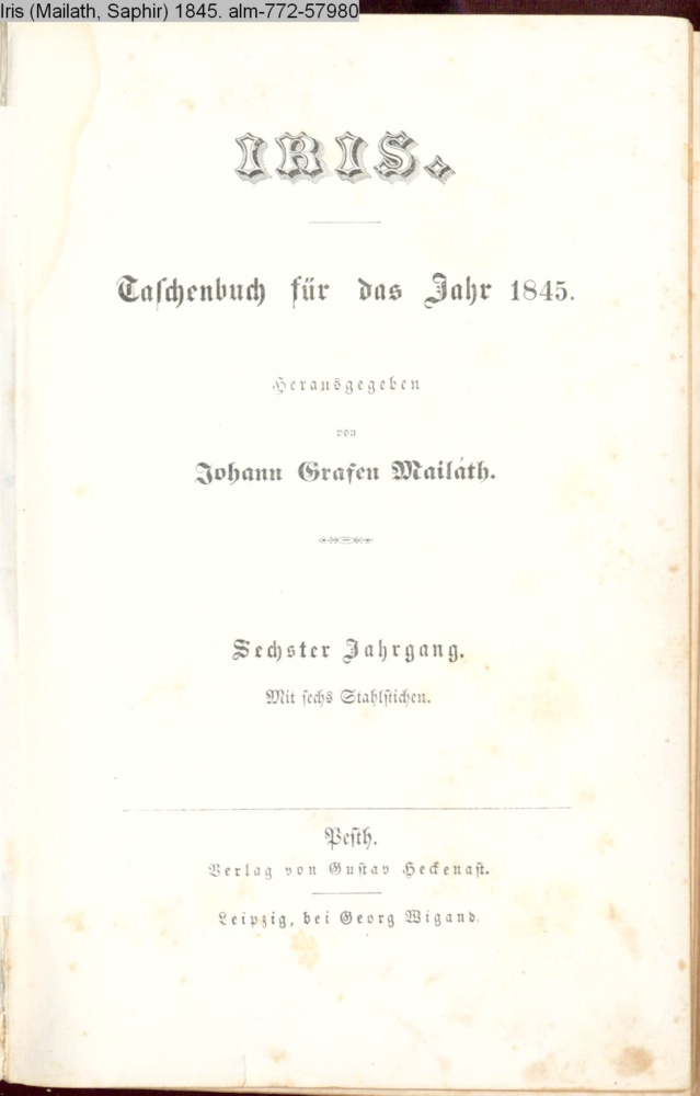 IRIS. / Taschenbuch für das Jahr 1845. / Herausgegeben / von / Johann Grafen Mailáth. / Sechster Jahrgang. / Mit sechs Stahlstichen / Pesth. / Verlag von Gustav Heckenast. / Leipzig, bei Georg Wigand