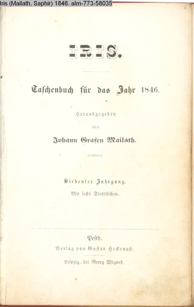 IRIS. / Taschenbuch für das Jahr 1846. / Herausgegeben / von / Johann Grafen Mailáth. / Siebenter Jahrgang. / Mit sechs Stahlstichen / Pesth. / Verlag von Gustav Heckenast. / Leipzig, bei Georg Wigand