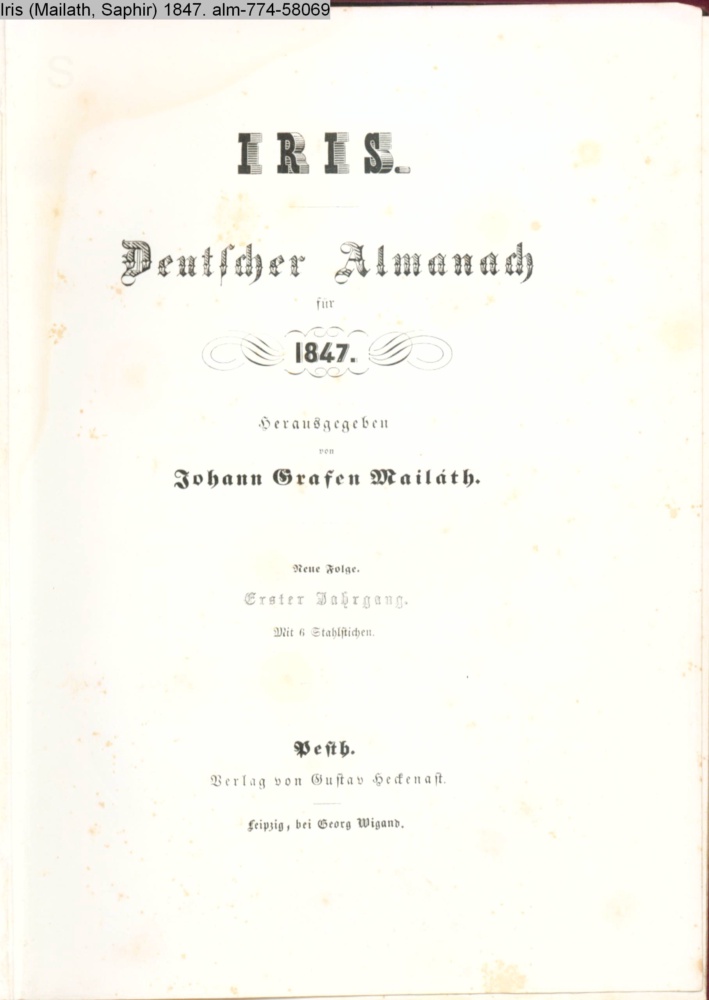 IRIS. / Deutscher Almanach / für / 1847. / Herausgegeben / von / Johann Grafen Mailáth. / Neue Folge. / Erster Jahrgang. / Mit 6 Stahlstichen. / Pesth. / Verlag von Gustav Heckenast. / Leipzig, bei Georg Wigand