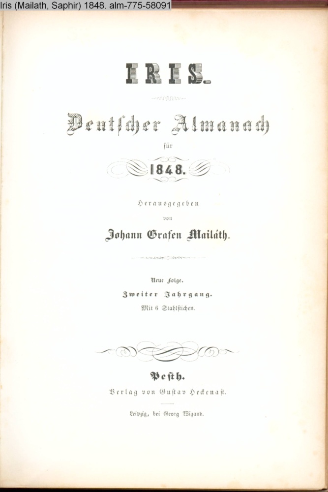 IRIS. / Deutscher Almanach / für / 1848. / Herausgegeben / von / Johann Grafen Mailáth. / Neue Folge. / Zweiter Jahrgang. / Mit 6 Stahlstichen. / Pesth. / Verlag von Gustav Heckenast. / Leipzig, bei Georg Wigand