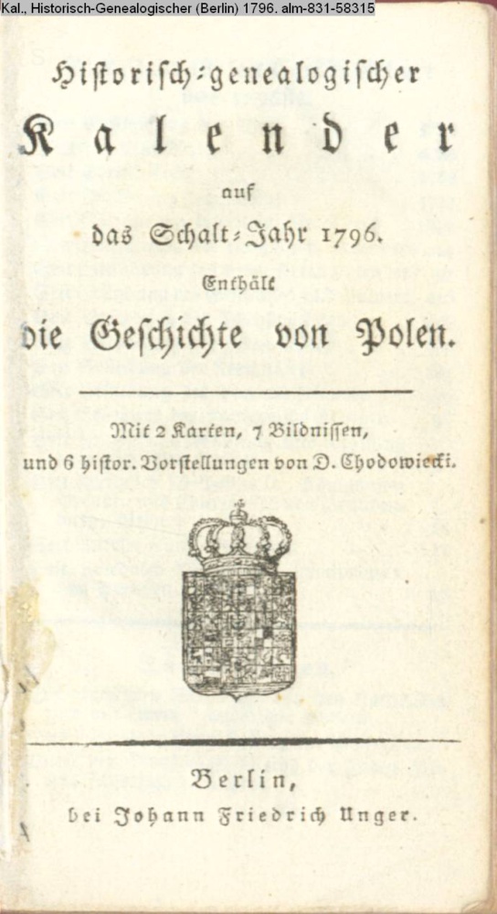 Historisch-genealogischer / Kalender / auf / das Schalt-Jahr 1796. / Enthält / die Geschichte von Polen. / Mit 2 Karten, 7 Bildnissen, / und 6 histor. Vorstellungen von D. Chodowiecki. / Berlin, / bei Johann Friedrich Unger