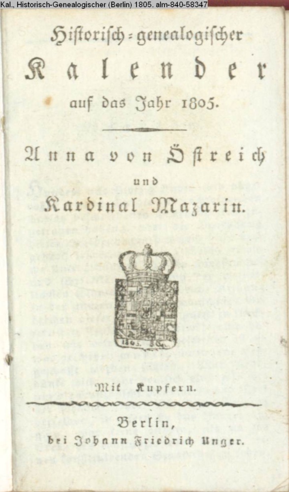 Historisch-genealogischer / Kalender / auf das Jahr 1805. / Anna von Östreich / und / Kardinal Mazarin. / Mit Kupfern. / Berlin, / bei Johann Friedrich Unger