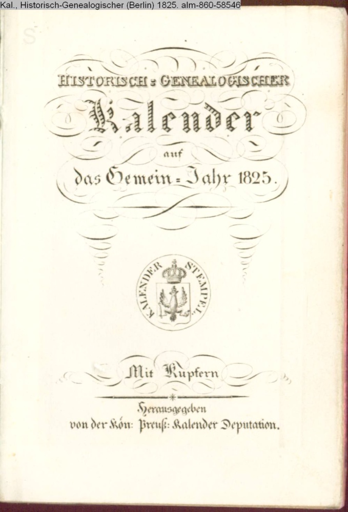 HISTORISCH-GENEALOGISCHER / Kalender / auf / das Gemein-Jahr 1825. / Mit Kupfern / Herausgegeben / von der Kön. Preuß. Kalender-Deputation