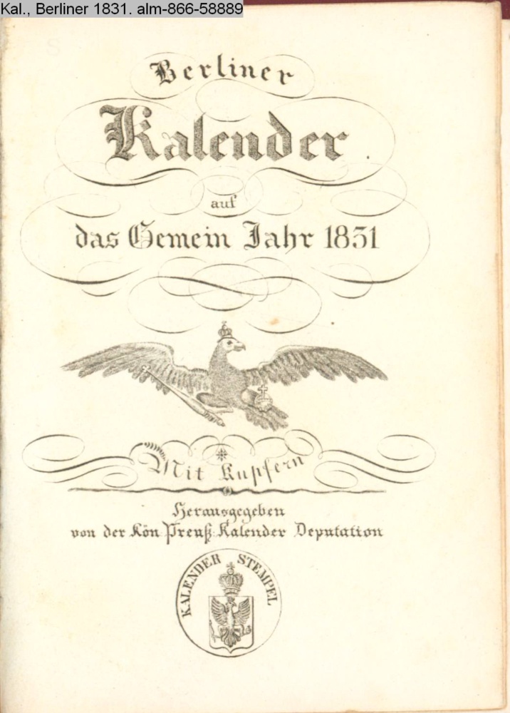 BERLINER / Kalender / auf / das Gemein Jahr 1831. / Mit Kupfern / Herausgegeben / von der Kön. Preuß. Kalender Deputation