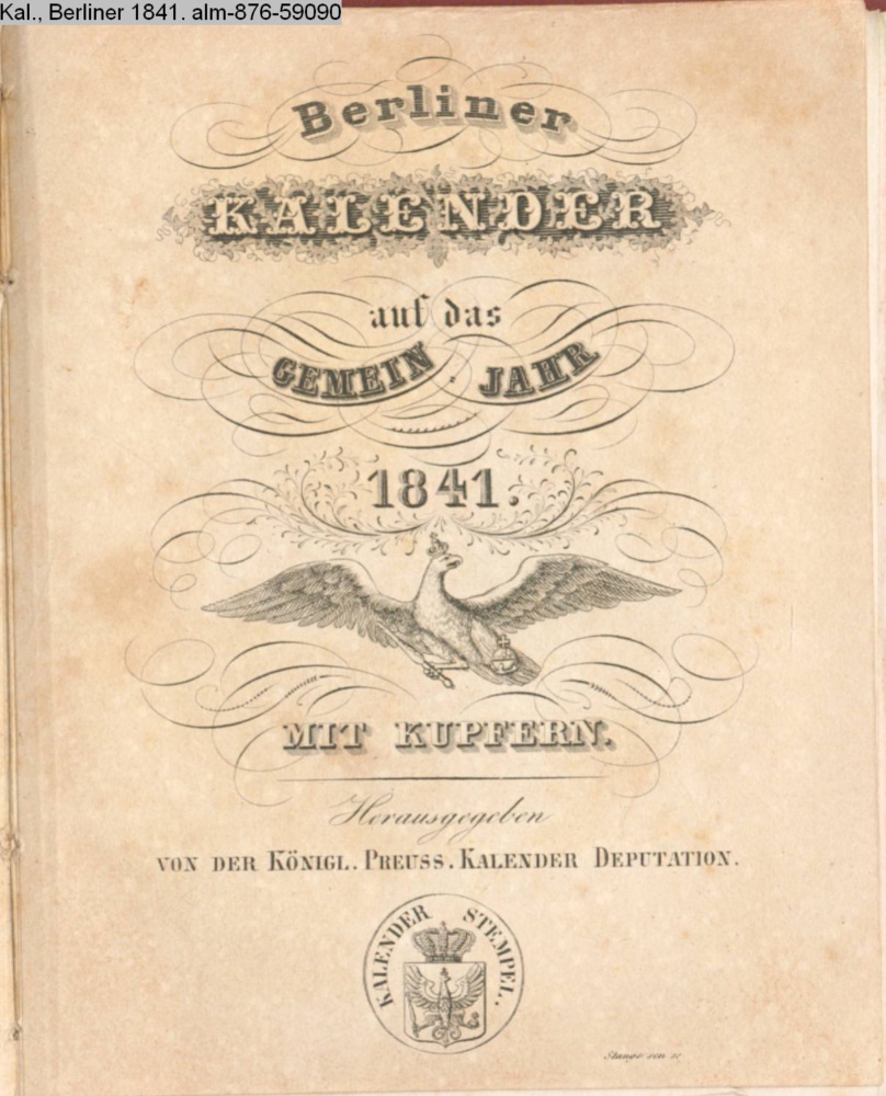Berliner / KALENDER / auf / das GEMEIN JAHR / 1841. / MIT KUPFERN. / Herausgegeben / VON DER KÖNIGL. PREUSS. KALENDER DEPUTATION