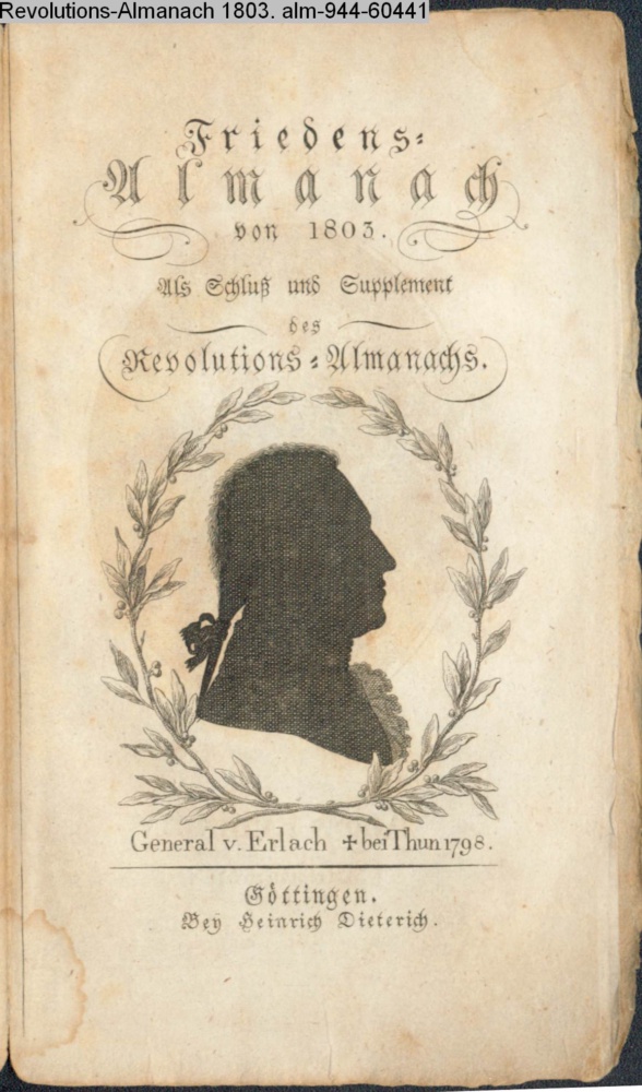 Friedens- / Almanach / von 1803. / Als Schluß und Supplement / des / Revolutions-Almanachs. / Göttingen. / Bey Heinrich Dieterich
