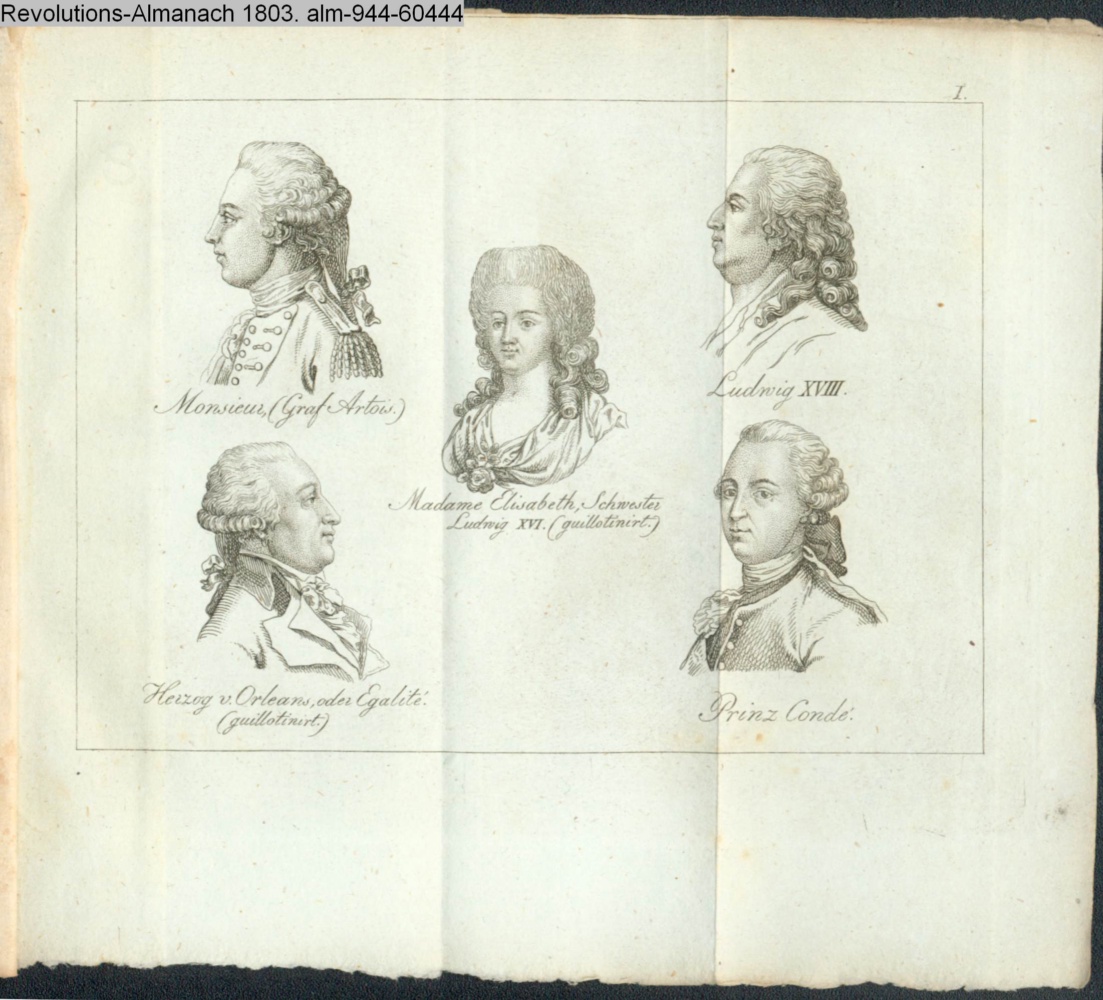 Monsieur, (Graf Artois). Madame Eilsabeth, Schwester Ludwig XVI. (guillotiniert.) Ludwig XVIII. / Herzog v. Orleans, oder Egalité. (guillotiniert.) Prinz Condé