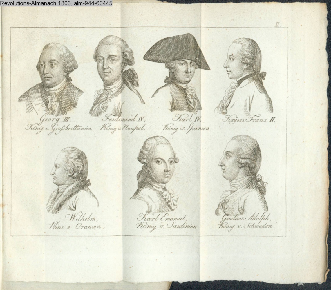 Georg III. / König v. Grossbrittanien. Ferdinand IV. König v. Neapel. Karl IV. König v. Spanien. Kayser Franz II. / Wilhelm, Prinz v. Oranien. Karl Emanuel, König v. Sardinien. Gustav Adolph, König v. Schweden