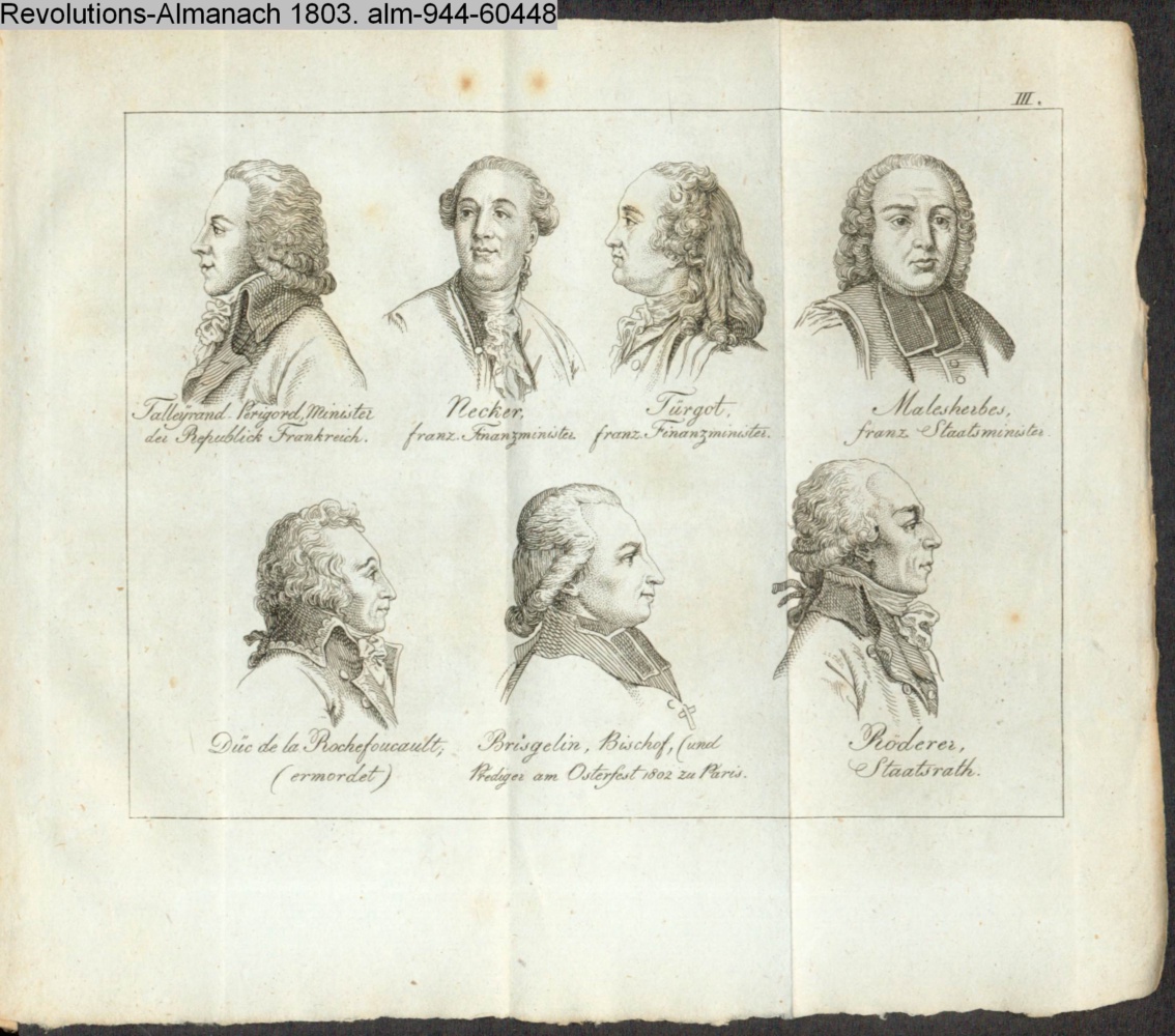 Talleyrand Perigord, Minister der Republik Frankreich. Necker, franz. Finanzminister. Turgot, farnz. Finanzminister. Malesherbes, franz. Staatsminister. / Düc de la Rochefoucault, (ermordet) Brisgelin, Bischof, und Prediger am Osterfest 1802 zu Paris. Röderer, Staatsrath