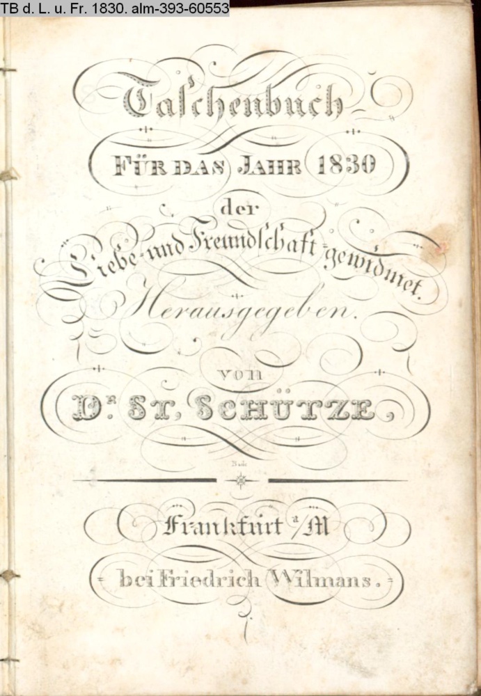 Taschenbuch / FÜR DAS JAHR 1830 / der / Liebe und Freundschaft gewidmet. / Herausgegeben / von / Dr. ST. SCHÜTZE. / Frankfurt a/M / bei Friedrich Wilmans