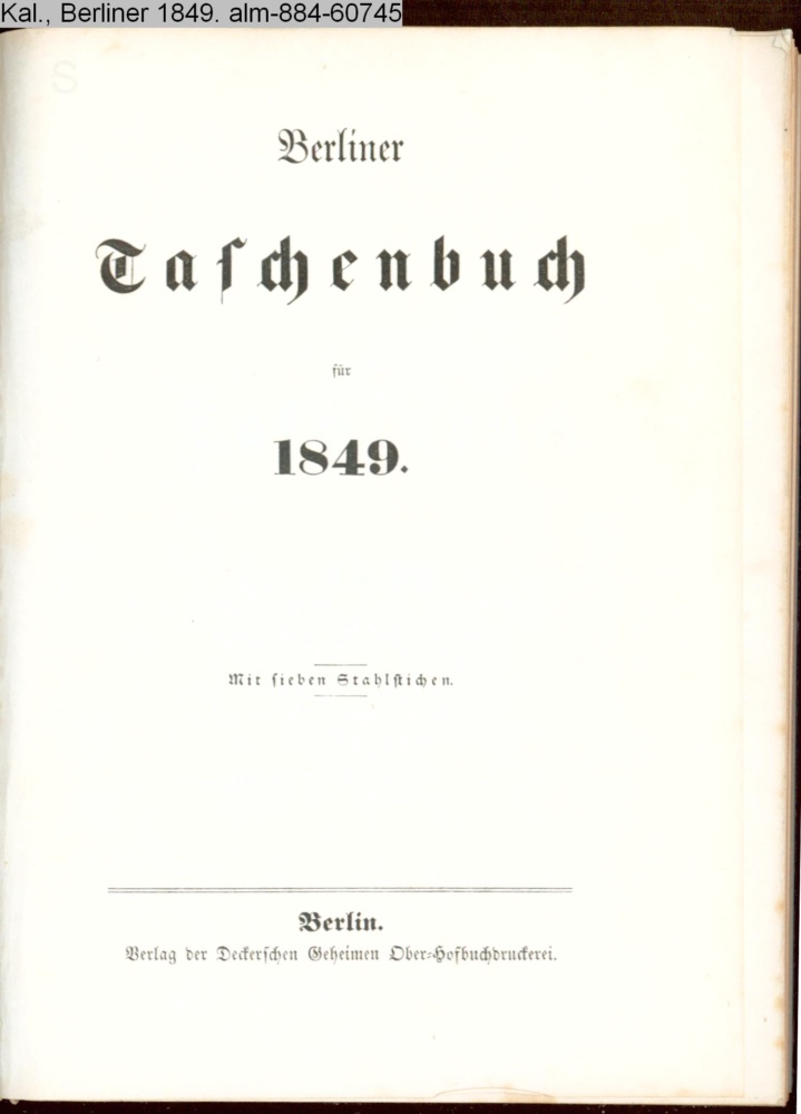 Berliner / Taschenbuch / für / 1849. / Mit sieben Stahlstichen. / Berlin. / Verlag der Deckerschen Geheimen Ober-Hofbuchdruckerei