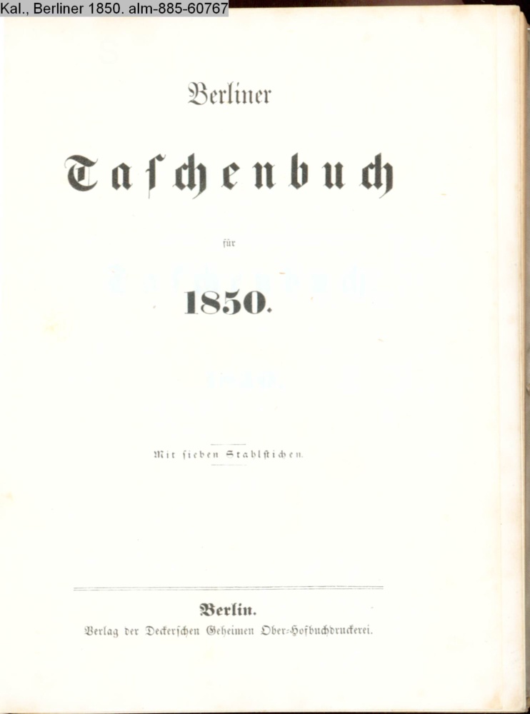 Berliner / Taschenbuch / für / 1850 / Mit sieben Stahlstichen. / Berlin. / Verlag der Deckerschen Geheimen Ober-Hofbuchdruckerei